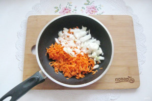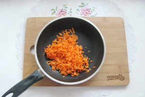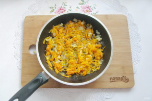 Pour refined sunflower oil and 50 ml of water into a frying pan. Cover with a lid and simmer the carrots and onions over medium heat until soft.