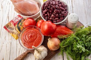 Рецепт не отнимет много времени. Потрясающе вкусное блюдо для любителей грузинской кухни. Сытное блюдо из курицы и фасоли, которые тушатся в томатном соусе со специями. Прекрасный вариант обеда или ужина для всей семьи Подавайте горячим.