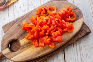 Сладкий перец очистите от семян. Мякоть нарежьте тонкими полосками.