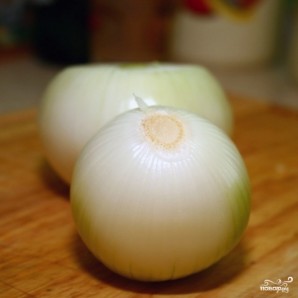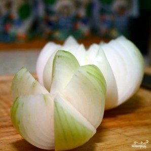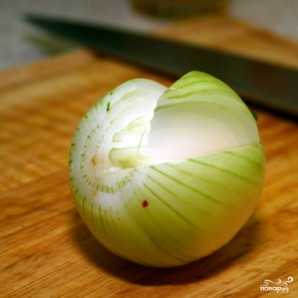 Первым делом очищаем лук. Очень важно не отрезать корень лука слишком глубоко - благодаря нему наша луковая роза не развалится при обжаривании. Если же срезать корень слишком глубоко, лук развалится.