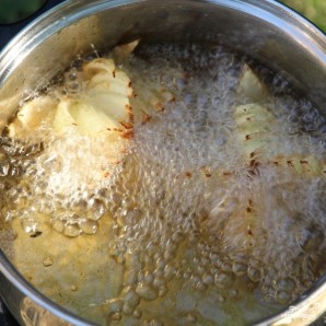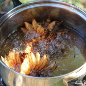 В кастрюле или жаровне разогреваем большое количество масла, кладем в него наши луковые розы.