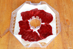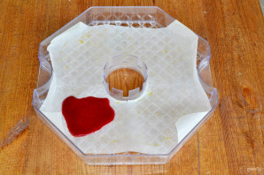 In small portions, place the berry puree onto the tray. Spread it into a thin, even layer. Put it in the dehydrator at a temperature of 65 degrees. You can also dry the fruit leather on a baking sheet in the oven.