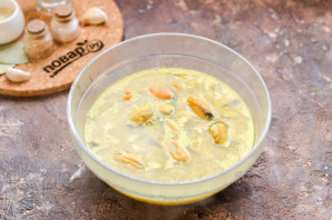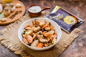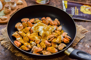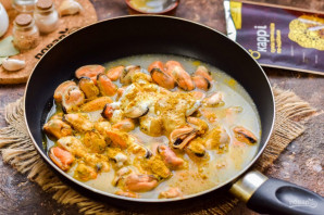 The recipe won't take much time. It's the curry that gives mussels and the sauce their flavor. To slightly enhance the sauce, I add a bit of sweet mustard and sour cream. When serving, you can sprinkle these mussels with fresh herbs. I like serving mussels with rice, but you can choose any other side dish to your taste. Serve hot.