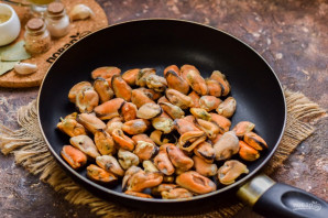 In a skillet, heat a little vegetable oil, add the mussels, and fry for a couple of minutes.
