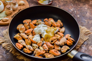 Add sour cream and mustard to the mussels in the pan.