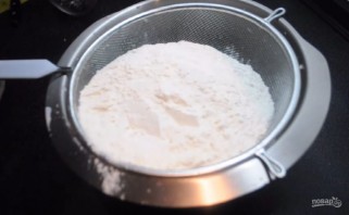 2. Просейте в молочную массу муку, добавьте соду и разрыхлитель, замесите тесто. При необходимости добавьте еще муки.