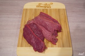 Beef meat should be processed by removing tendons and membranes. Cut the clean meat into slices. Pound with a wooden mallet.