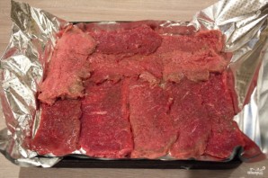 Place the sliced and pounded meat onto a sheet of foil greased with oil. Season with salt and pepper to taste.