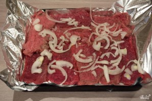 Slice the onion into half-rings. Place on the prepared meat.