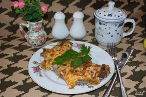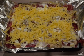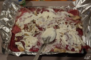 Grind the mushrooms. Place them on top of the onion. Pour the sour cream over the meat, spreading it evenly over the entire surface of the meat.