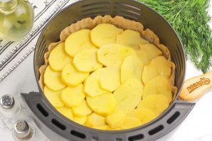 To properly cook meat à la française, bake it in layers: first potatoes, then meat, and finally cheese on top. You can optionally add onions and tomatoes, but they should also be baked layer by layer, since the air fryer only heats from above. If you place all the layers at once, the potatoes and meat won't cook through and will remain raw, while the cheese will burn.