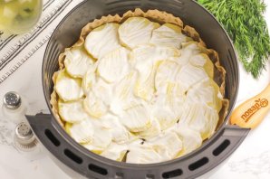 Carefully spread the potato layer with sour cream of any fat content or mayonnaise. You can simply spray with vegetable oil. Bake the potatoes for 15 minutes at 180 degrees. Remember that the slices should not be too thick.