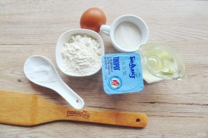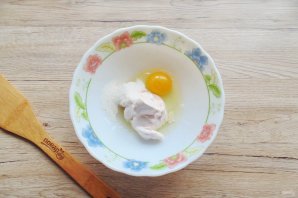 В глубокую миску выложите детский творожок. Добавьте яйцо, сахар, соль, соду. Тщательно перемешайте или взбейте блендером.