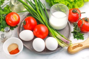 Подготовьте указанные продукты. По желанию можно использовать любые специи и пряности. Помидоры для подачи можно заменить огурцами, болгарским перцем и т.д.