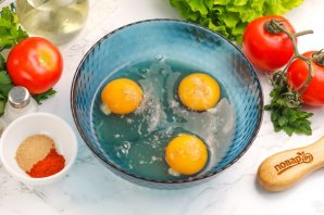 Куриные яйца вбейте в глубокую емкость: миску или салатник. По желанию их можно заменить перепелиными яйцами в количестве 8-10 штук или 2 утиными. Всыпьте соль и молотый черный перец.