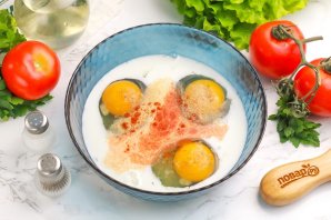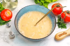 Тщательно взбейте все вилкой или венчиком в течение 2-3 минут. Не нужно взбивать до пышной пены, важно смешать белки и желтки с молоком и специями.