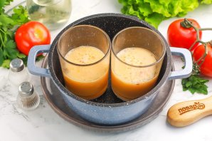 Разлейте в стаканы взбитую яичную массу примерно чуть выше половины, так как омлет будет расти в процессе пропаривания.