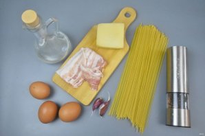Prepare the necessary ingredients for making carbonara pasta. Long types of pasta are suitable for carbonara: fettuccine, spaghetti, tagliatelle, linguine. Traditional carbonara uses guanciale (cured pork cheek), which can be substituted with pancetta, bacon, or pork belly.