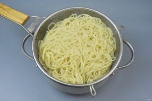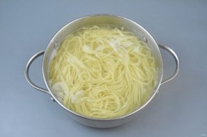 Bring water to a boil in a saucepan of appropriate size, add salt. Place the prepared spaghetti into the saucepan.