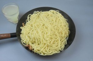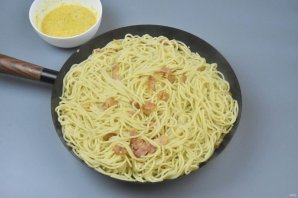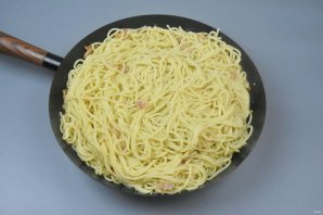 Transfer the spaghetti to the pan with the bacon. Mix and turn off the heat.