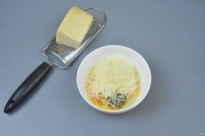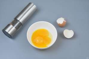 Mix the egg yolks with a fork, add half of the grated Parmesan cheese, salt, and ground black pepper. Stir the mixture.
