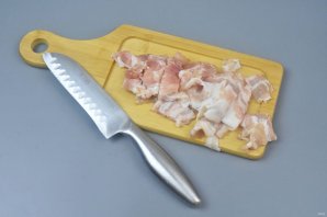 Heat olive oil in a skillet and add the prepared bacon pieces. Fry until browned and the fat has rendered out.