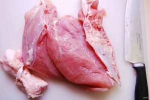 1. Срежьте кожу с грудинки, обрежьте любые хрящи или мелкие кости. Хорошенько вымойте мясо и вытрите его насухо бумажными салфетками.