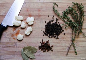 3. Очистите и раздавите зубчики чеснока, добавьте его в кастрюлю, а также 1 столовую ложку перца, 8 веточек тимьяна, гвоздику, лавровый лист. Размешайте и отставьте рассол для остывания.