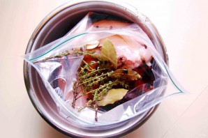 4. Поместите индейку в закрывающийся пакет, влейте охлажденный рассол вместе со всеми специями, закройте плотно и отправьте в холодильник на 2 дня.