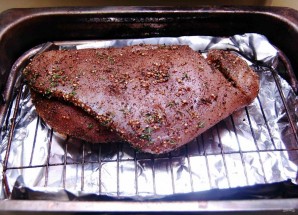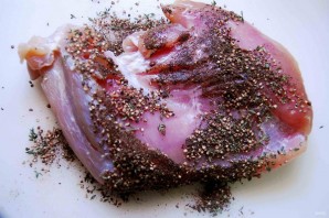 5. Спустя пару дней удалите мясо из рассола, затем хорошенько промойте под холодной водой и вытрите его насухо. Измельчите ножом черный перец, тимьян и натрите полученной смесью мясо.