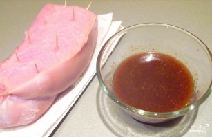 Куриное мясо промойте и положите просушиться на полотенце. Затем приготовьте маринад. В любой удобной посуде соедините мед, горчицу, соевый соус, соль, перец и три ложечки масла. Наколите филе несколькими зубочистками в разных местах.