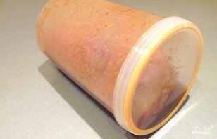 Грудку положите в контейнер или банку, залейте приготовленным маринадом и закройте плотно крышкой. В таком виде филе поставьте в холодильник на пять часов. Каждый час вынимайте банку и встряхивайте.