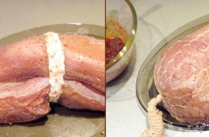 Замаринованное филе туго скрутите кулинарной нитью. Удобнее делать это при помощи медицинского бинта, если таковой есть под рукой. Оберните филе бинтом и туго свяжите концы.