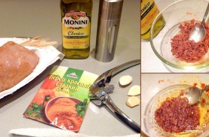 Теперь вам необходимо приготовить смесь для натирания. Для этого возьмите остаток масла, предварительно измельченный чеснок, красный перец, смешайте все до консистенции густой кашицы. Затем натрите этой смесью грудку, не разматывая ее.