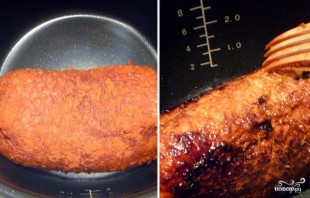 Поставьте на мультиварке режим "запекание" или "жарка". По пять минут обжаривайте филе с каждой стороны до образования хрустящей корочки. Затем добавьте в чашу мультиварки 200 мл. воды и в режиме "тушение" готовьте грудку еще сорок минут.