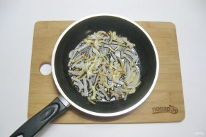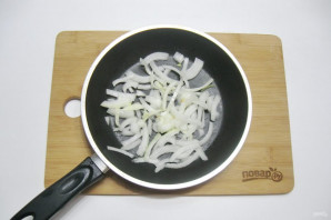 Peel the onion, wash it, and slice into half-rings. Place in a frying pan.