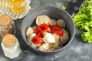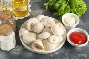 Подготовьте указанные ингредиенты. Пельмени приобретите в магазине или приготовьте в домашних условиях и заморозьте.