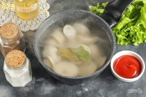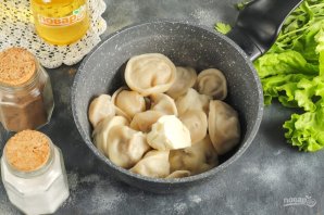 Слейте жидкость, удалите лавровые листья и выложите в емкость сливочное масло, перемешайте. Пельмени должны быть слегка недоваренными.