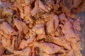 2. Семгу нужно отварить на пару, остудить и разломать на кусочки.