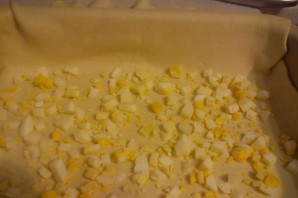 4. Форму для выпечки смазываем подсолнечным маслом. Тесто раскатываем, чтобы получилось в два раза больше дна формы. Выкладываем тесто на дно формы, оставляя часть снаружи. Сверху распределяем яйца.