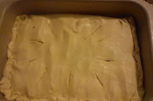 7. На тесте делаем разрезы для выхода пара. Выпекаем пирог в духовке 30 минут, температура 200 градусов.