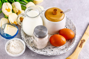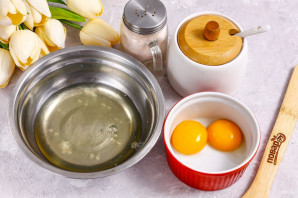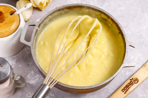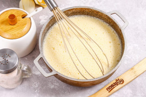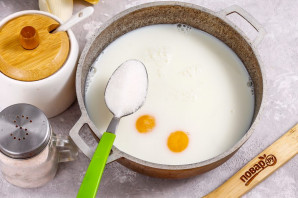 Meanwhile, pour milk of any fat content into a non-stick kazan or saucepan, add the egg yolks, sugar, and whisk.