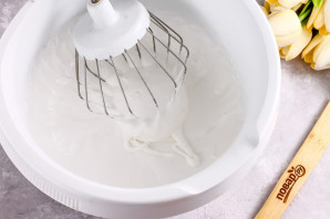 Transfer the egg whites to the blender bowl and beat with a pinch of salt for 3 minutes until fluffy foam forms. Then gradually add the sugar in parts and continue beating for another 3–4 minutes. Do not beat with sugar immediately, otherwise the meringue will not hold peaks on the whisk.
