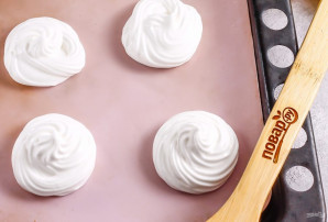 Pipe the meringue through a pastry bag onto a silicone mat or parchment paper and dry in the oven at 70-80°C for 2 hours, leaving the oven door slightly ajar. If the meringues are still sticky, they haven't dried enough.