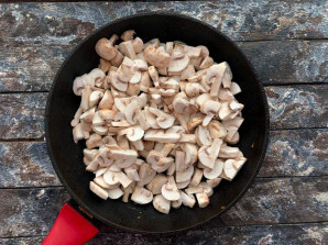Wash the mushrooms thoroughly under running water, cut into small pieces, and sauté in a dry skillet for 8–10 minutes.