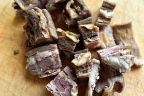 Boil the broth by covering the beef with 2 liters of water. Strain the broth, and cut the meat into pieces.