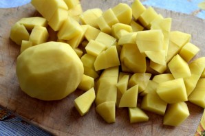 Peel the potatoes and cut them into cubes. Put them into the broth and cook until half-done.