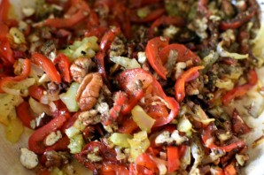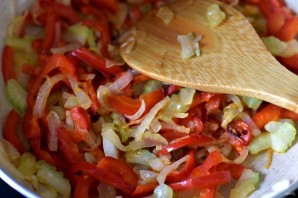 At the same time, sauté finely chopped onion and celery stalk in butter. A little later, add sweet pepper to the vegetables, and even later—chili pepper to taste.