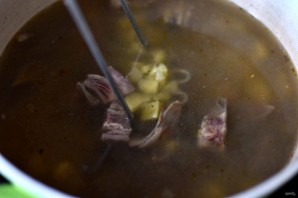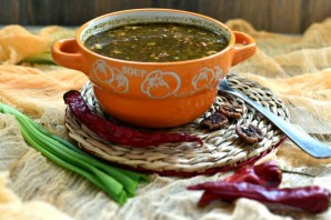 Hearty and aromatic soup. This soup is somewhat reminiscent of harcho, with nuts, beef brisket, and spices in the ingredients. The thick potato base and tender slightly sweet flavor make it unusual and unique, yet very delicious. Ladle into bowls and serve.
