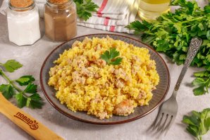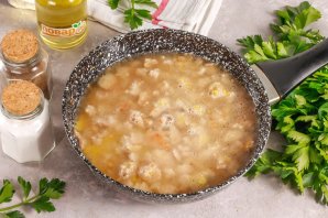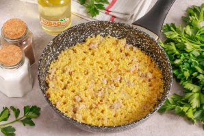 Когда фарш обжарится и подрумянится, добавьте в емкость промытое пшено и перемешайте.